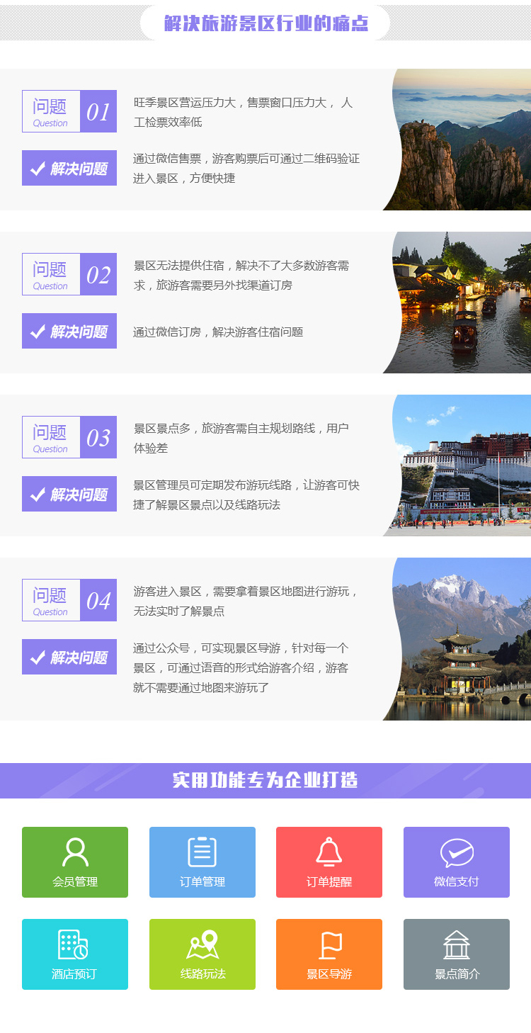 会员管理 订单管理 订单提醒 微信支付 酒店预越 线路玩法 景区导游 景点介绍